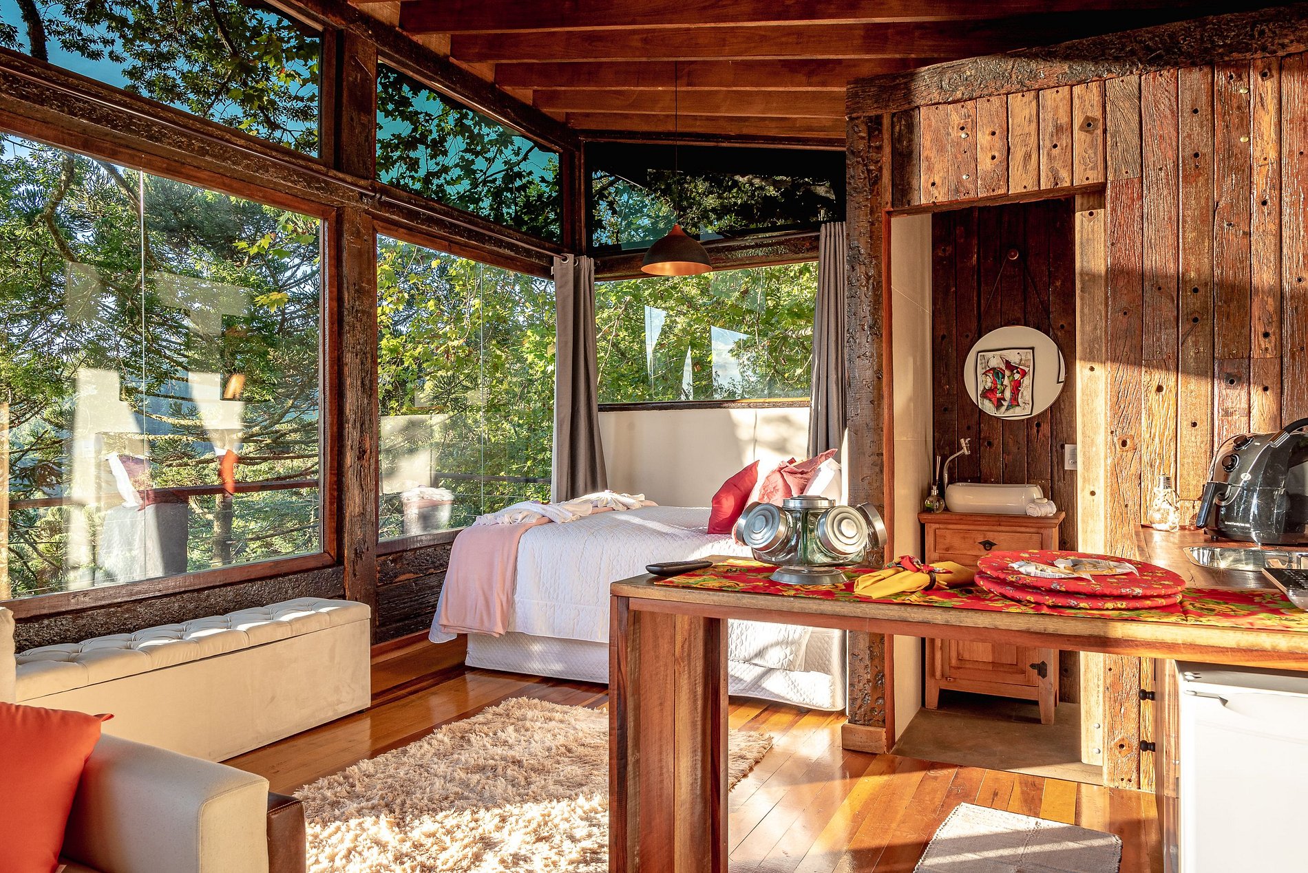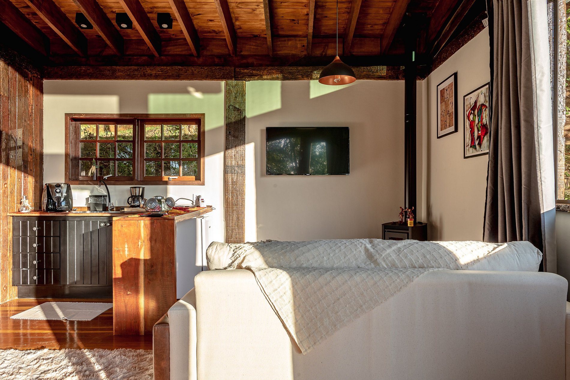 Contamos com quatro chalés incríveis, que proporcionam privacidade, além de uma área comum completa, com bar, piscina, mesas e fogo de chão — tudo para que você viva momentos inesquecíveis em meio à natureza.