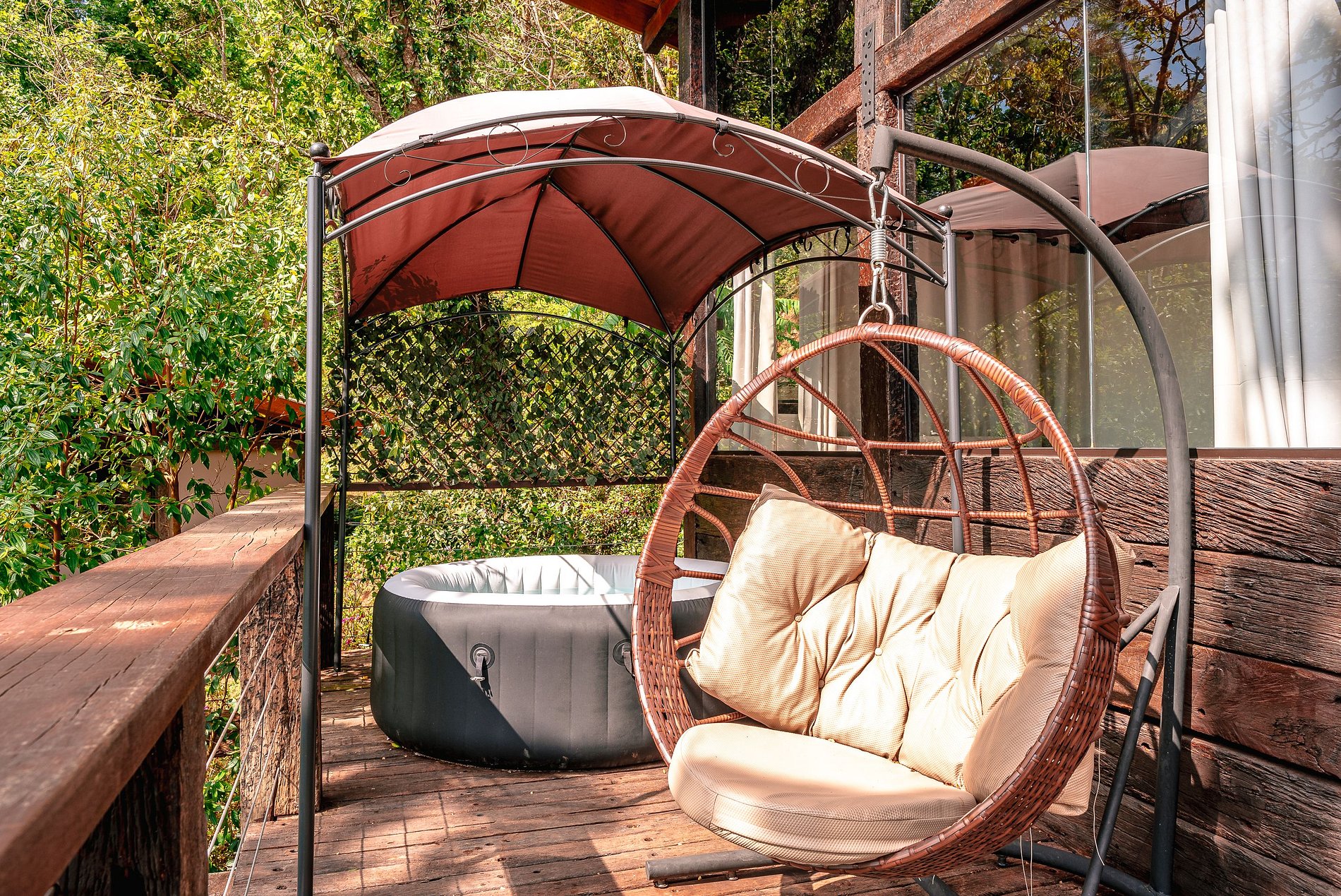 Contamos com quatro chalés incríveis, que proporcionam privacidade, além de uma área comum completa, com bar, piscina, mesas e fogo de chão — tudo para que você viva momentos inesquecíveis em meio à natureza.