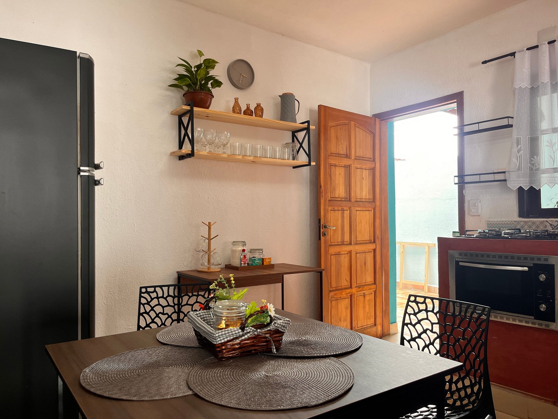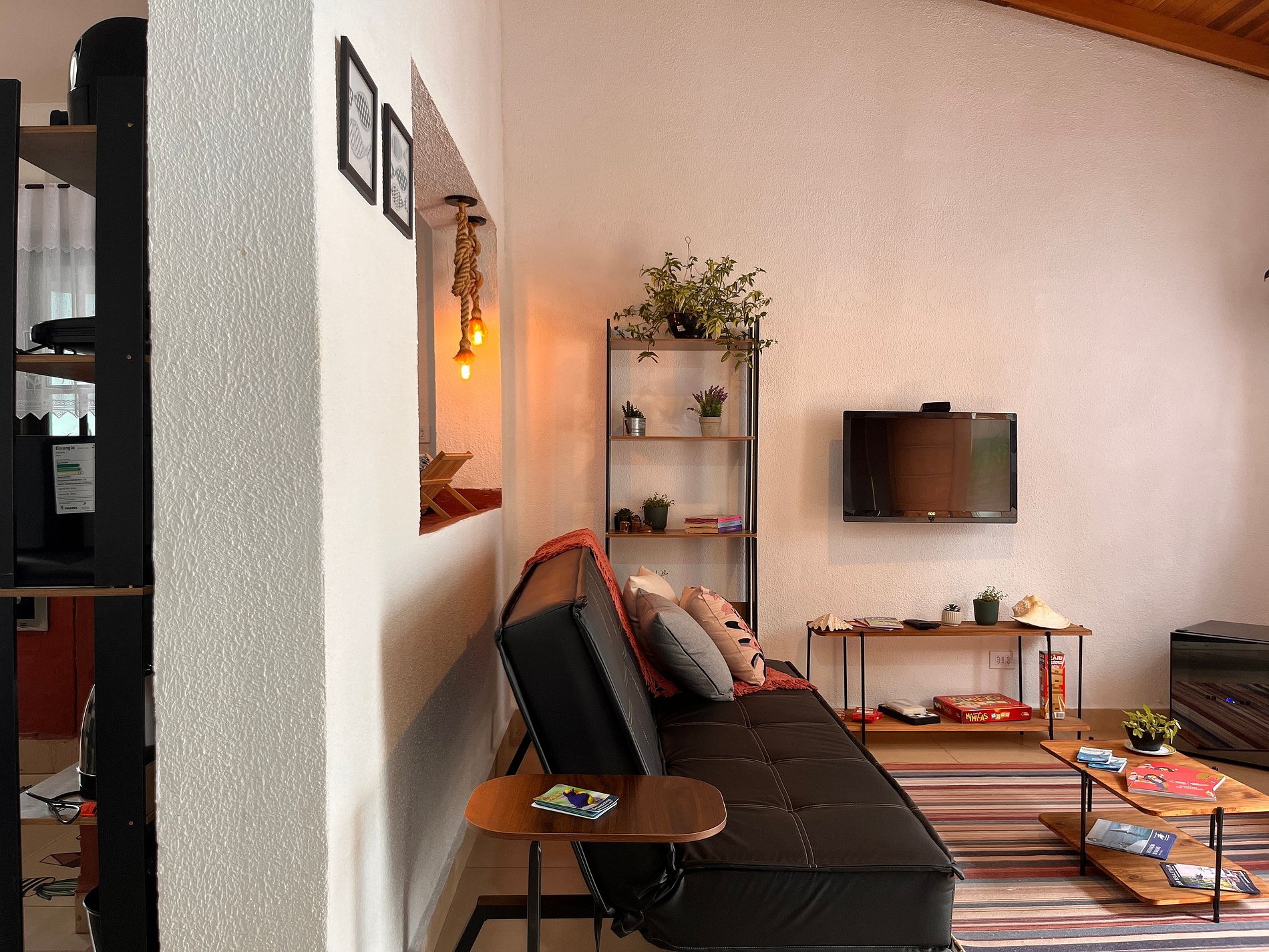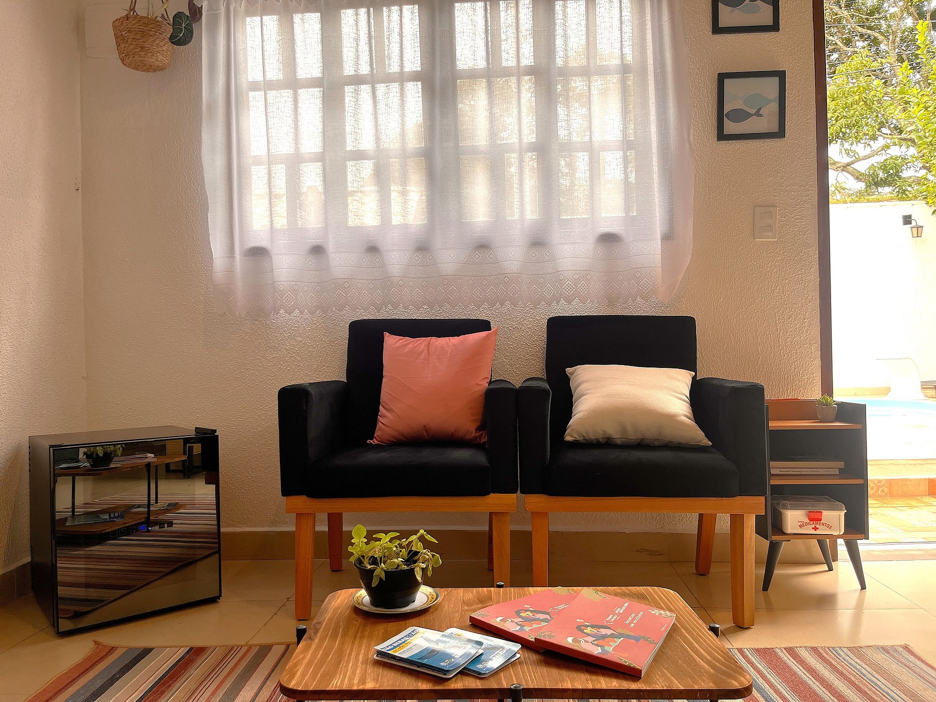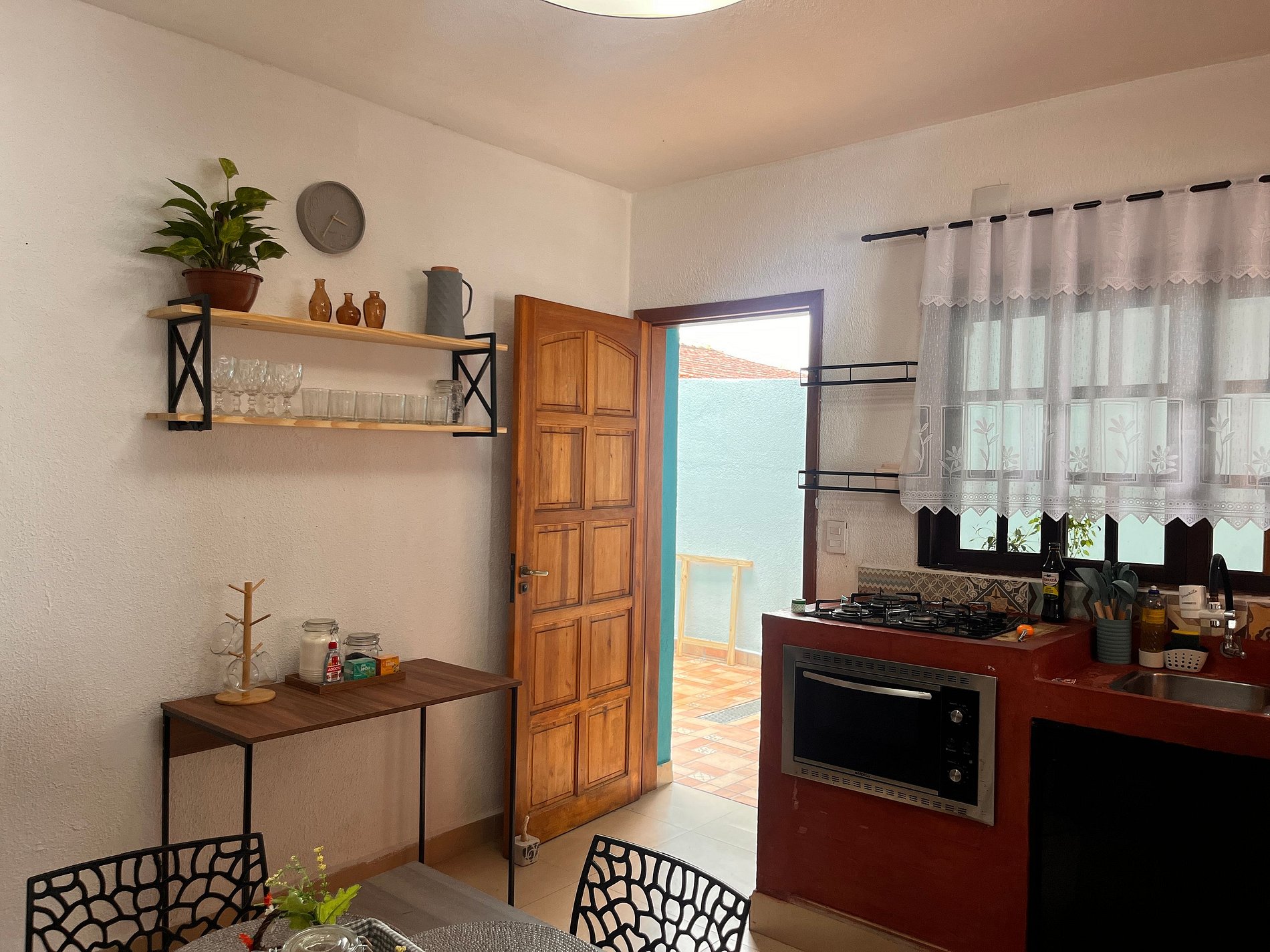 Com dois quartos, a casa acomoda até 8 pessoas com conforto. Os ambientes são amplos e bem iluminados, com sala aconchegante e cozinha completa equipada com air fryer, forno, cafeteira, micro-ondas, sanduicheira, torradeira e chaleira elétrica — perfeita para preparar boas refeições.