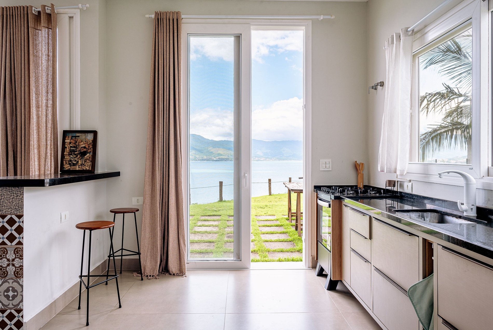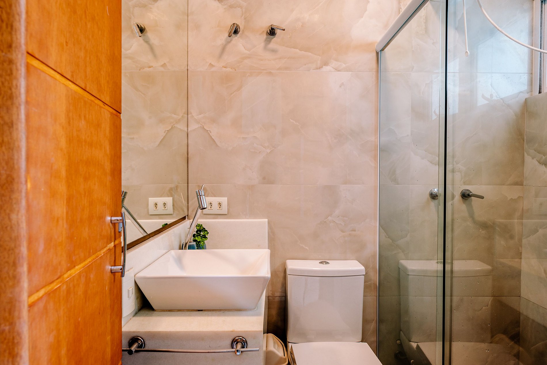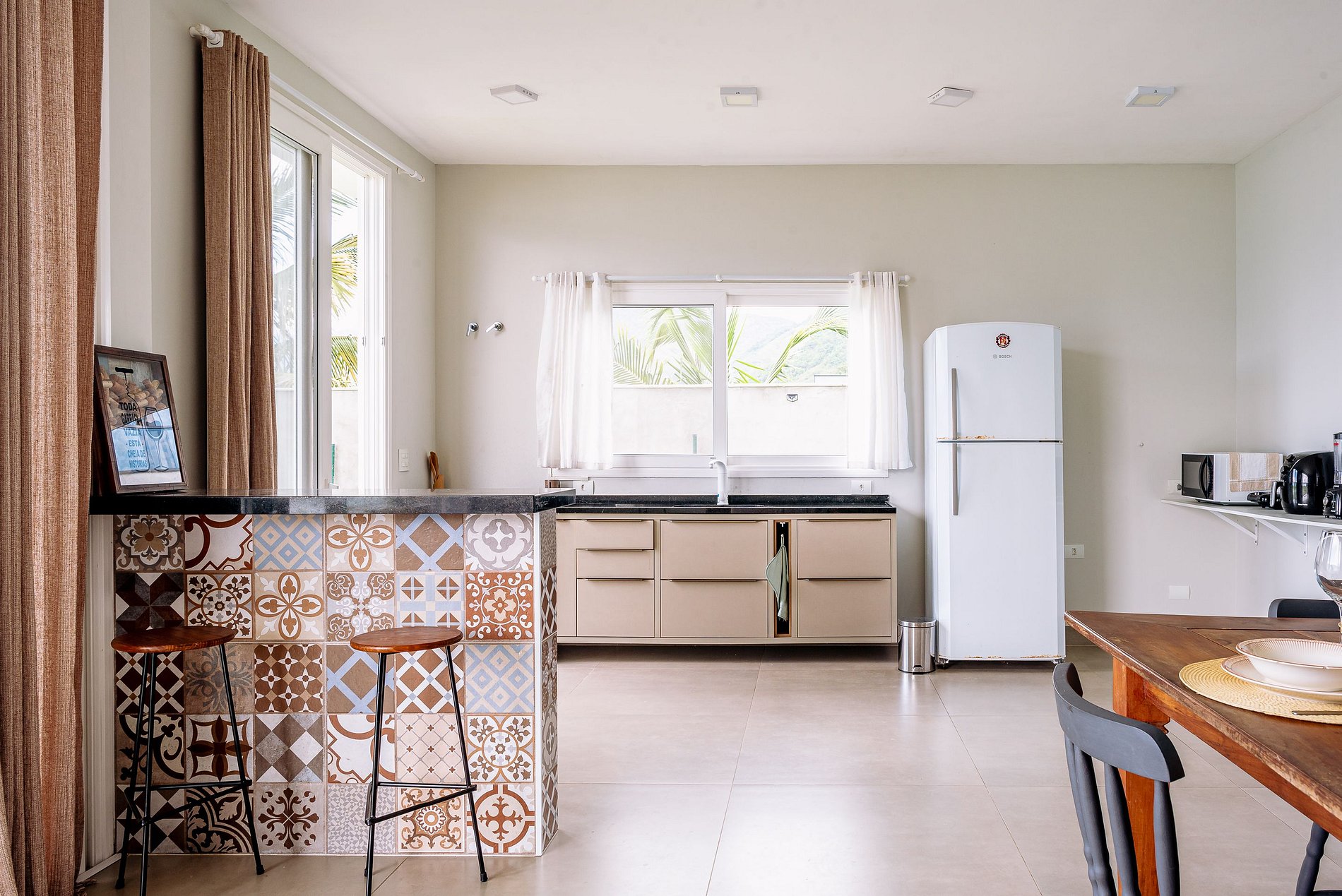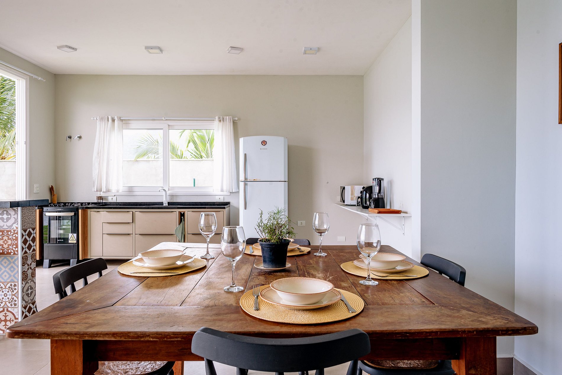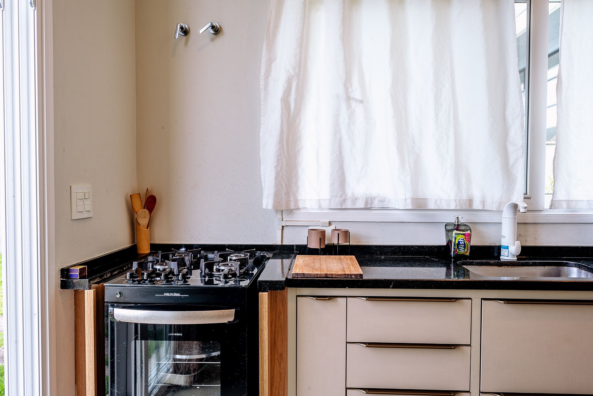 A cozinha conta com uma boa variedade de equipamentos e utensílios para facilitar o preparo das suas refeições: cafeteira, micro-ondas, airfryer, liquidificador, sanduicheira e outros itens estão à disposição para tornar sua estadia mais prática e agradável.