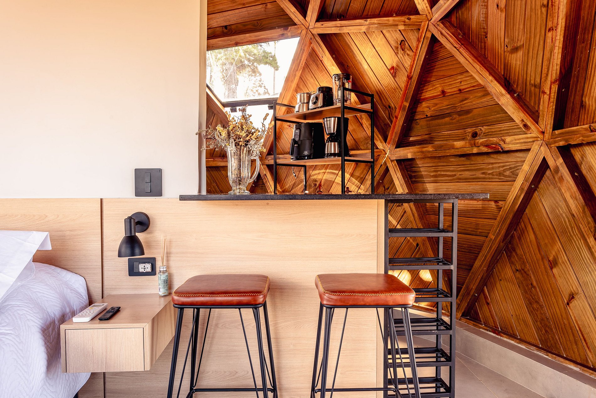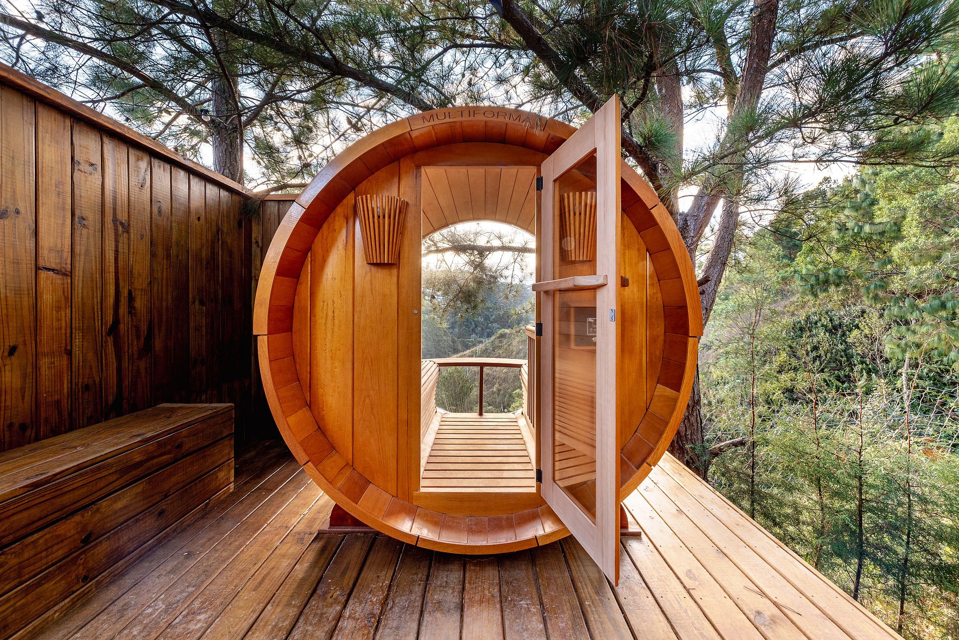 Para completar sua estadia, o andar superior se estende para um deck de madeira que circunda todo o domo. Aqui, você pode relaxar na rede suspensa, preparar uma refeição na lareira/churrasqueira, curtir a sauna seca com vista para a natureza, ou simplesmente desfrutar da mesa ao ar livre, enquanto aprecia o melhor pôr do sol da Serra da Mantiqueira.