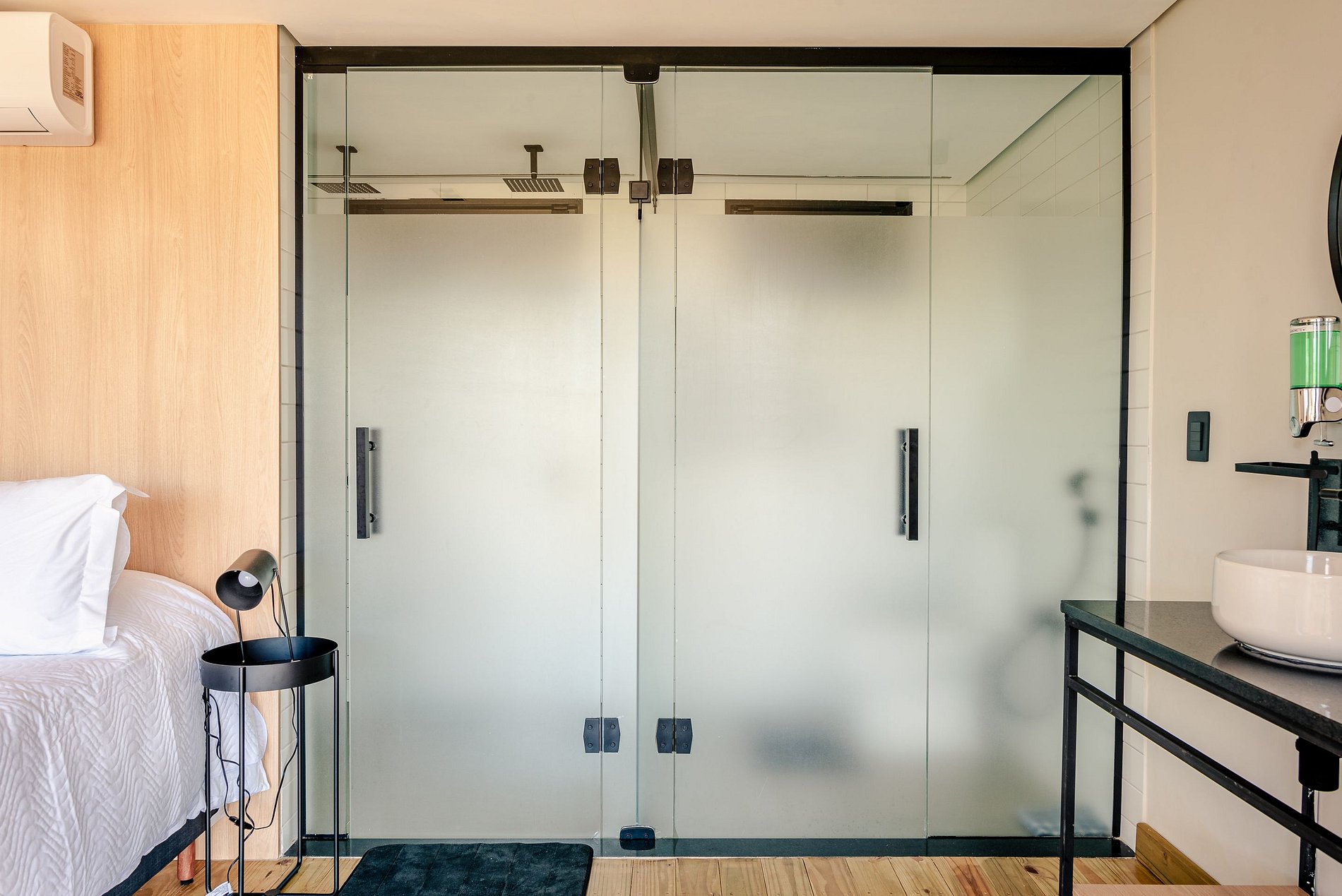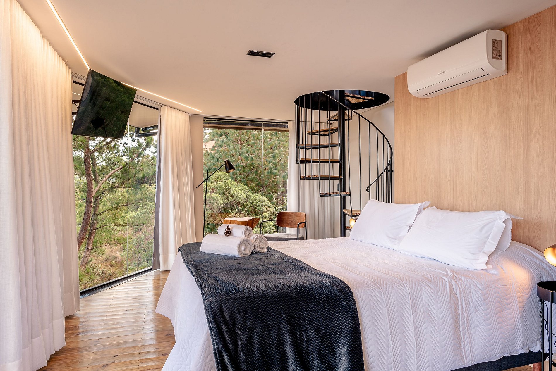 Descendo pela charmosa escada caracol, você encontrará o segundo quarto, cercado por paredes de vidro que oferecem uma vista deslumbrante. Este ambiente conta com uma cama queen, ar condicionado, Smart TV e cortinas blackout, além de um banheiro privativo com chuveiro duplo e uma aconchegante varanda.