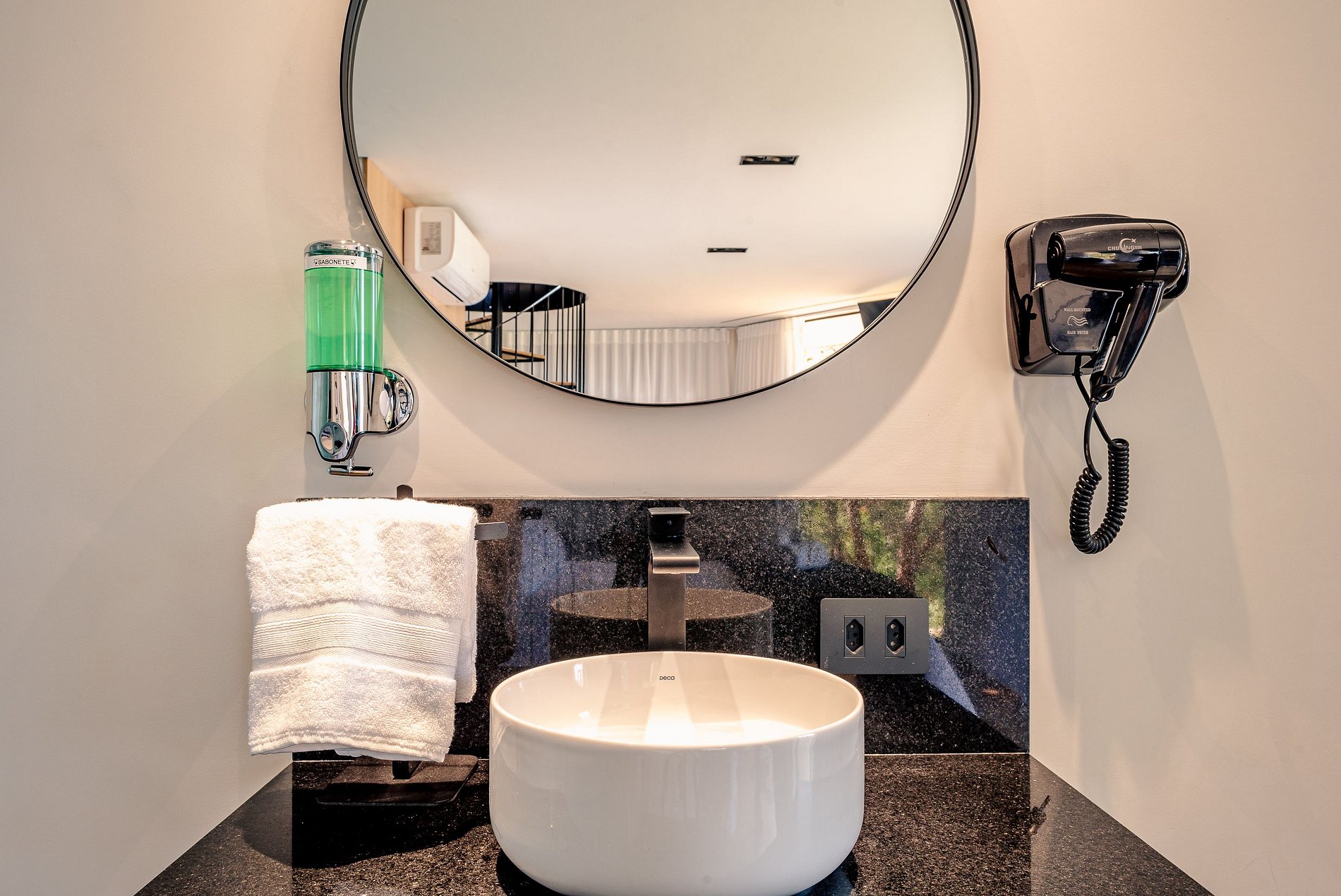 No andar superior, um quarto espaçoso com cama queen, ar condicionado e Smart TV está à sua disposição. Esse ambiente também integra uma cozinha completa, equipada com cooktop, geladeira, forno, micro-ondas, e todos os utensílios necessários para preparar suas refeições. O banheiro, elegante e funcional, oferece secador de cabelo, e aquecedor de toalhas, garantindo uma experiência de luxo.