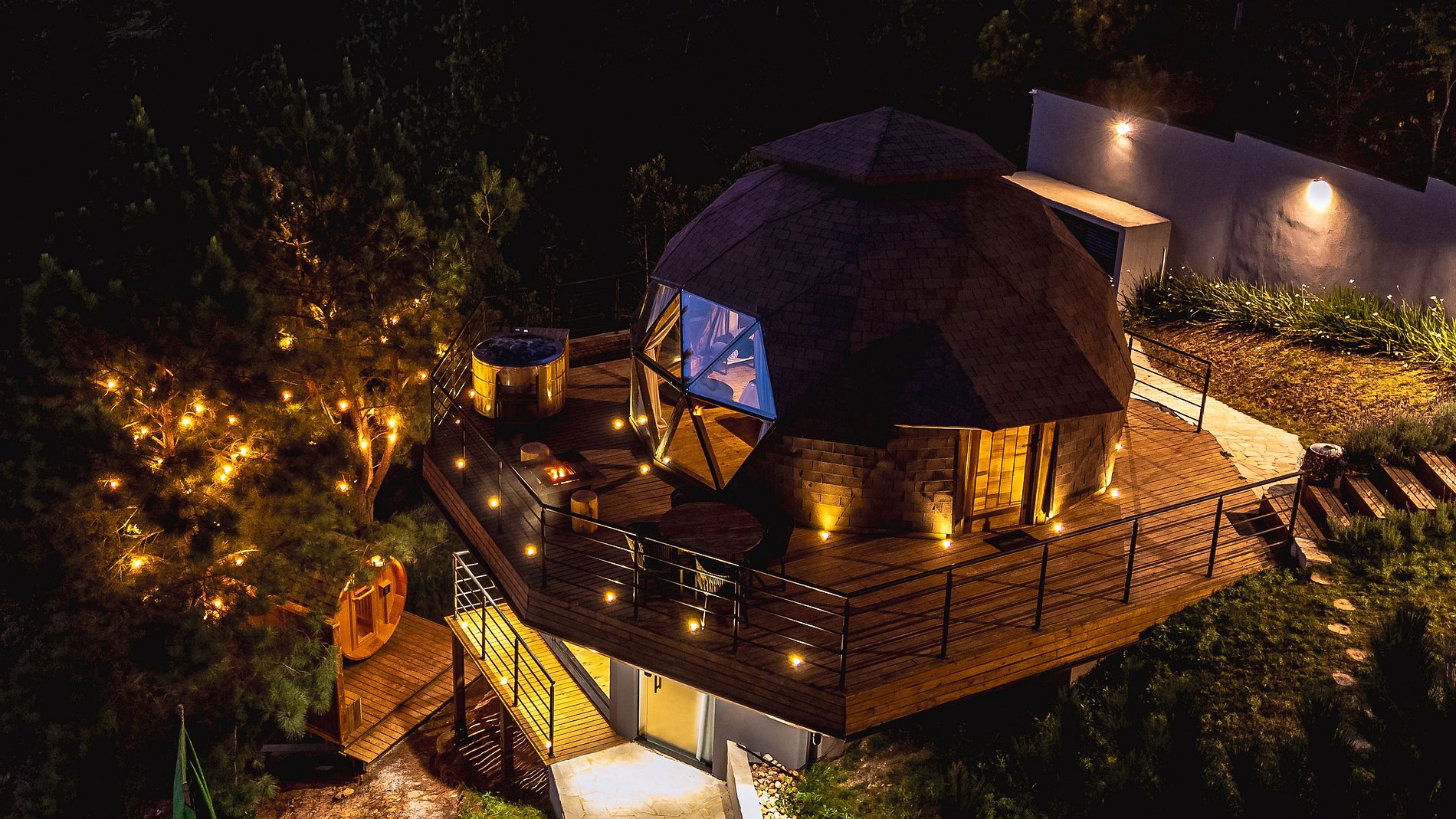 Ao chegar, você será recebido em um espaço projetado para até quatro pessoas, onde a privacidade e o conforto são prioridades. A entrada principal leva diretamente aos dois níveis do domo, cada um com acesso individualizado.