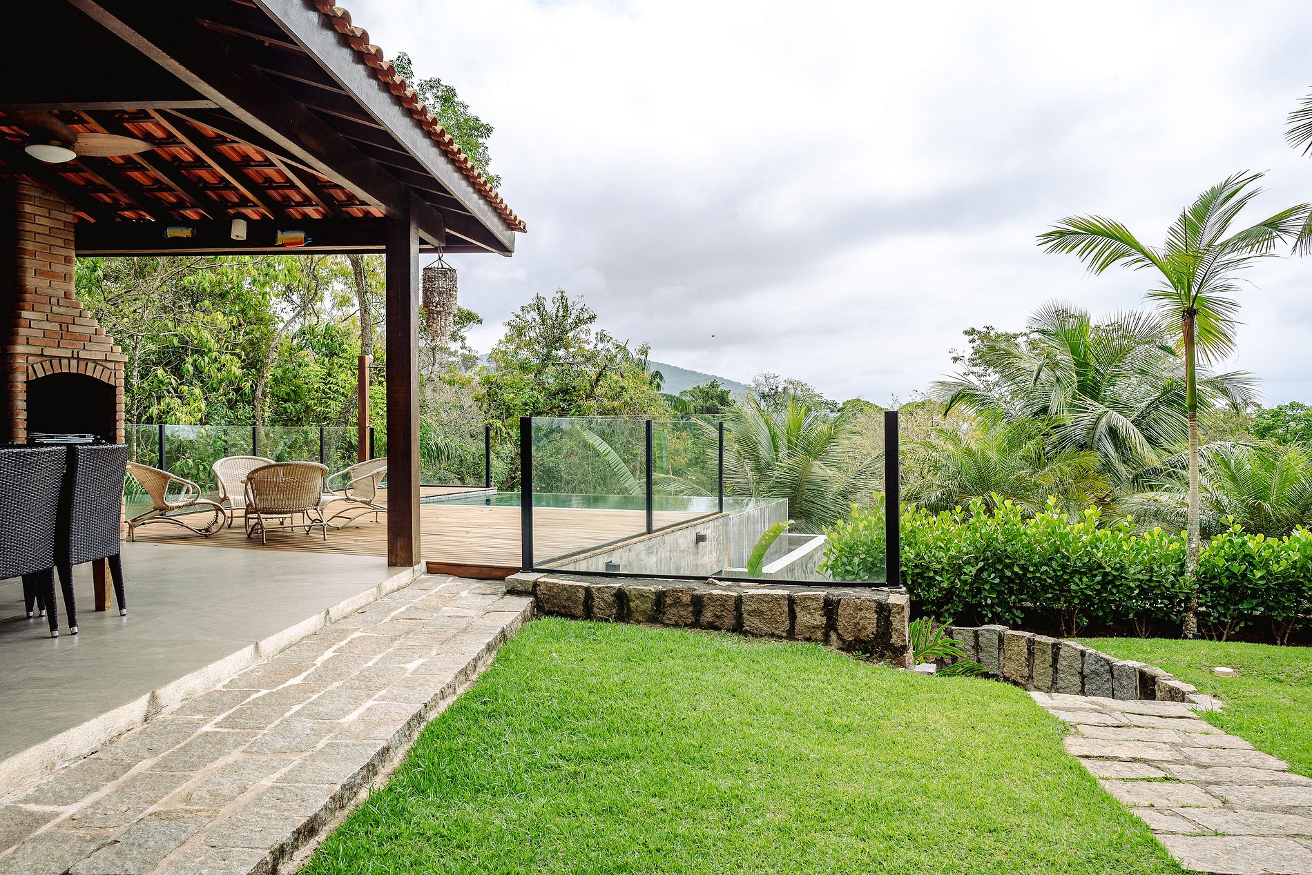 A área gourmet, integrada à piscina, oferece o cenário ideal para aproveitar o melhor da vida ao ar livre, seja com amigos ou em família. Projetado para lazer e descontração, esse espaço é perfeito para relaxar e desfrutar de cada momento com conforto e privacidade.