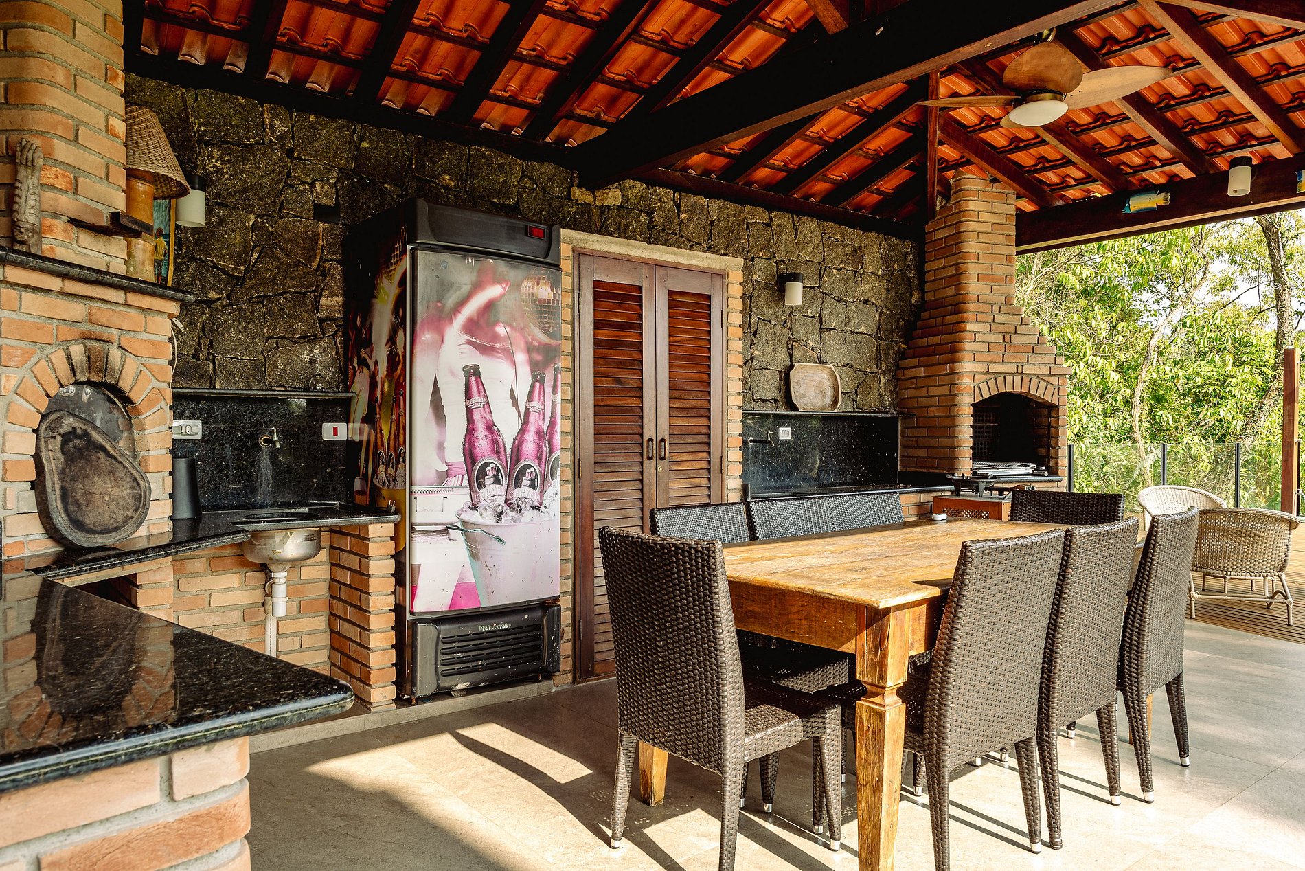 Para quem gosta de cozinhar, a área gourmet e a cozinha são bem equipadas, facilitando o preparo das refeições. Entre as comodidades estão um forno de pizza à lenha, churrasqueira e uma cervejeira, garantindo bebidas sempre geladas.