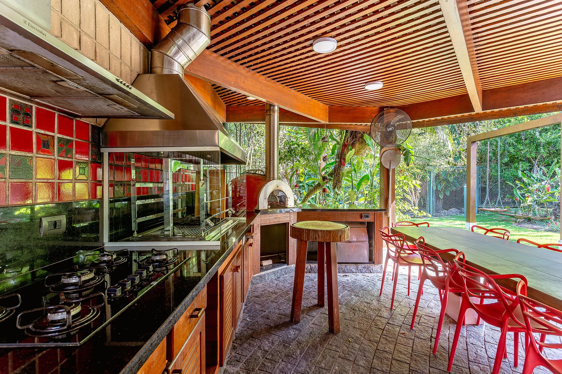 A área externa é o destaque da propriedade. A grande piscina, cercada de espreguiçadeiras, é perfeita para se refrescar nos dias mais quentes ou relaxar ao sol. O espaço gourmet é equipado com churrasqueira, fogão a lenha, forno de pizza, máquina de gelo e bancada de apoio, proporcionando momentos únicos de confraternização. Além disso, a casa oferece mesa de sinuca, mesa de ping-pong e um pula-pula para as crianças se divertirem.