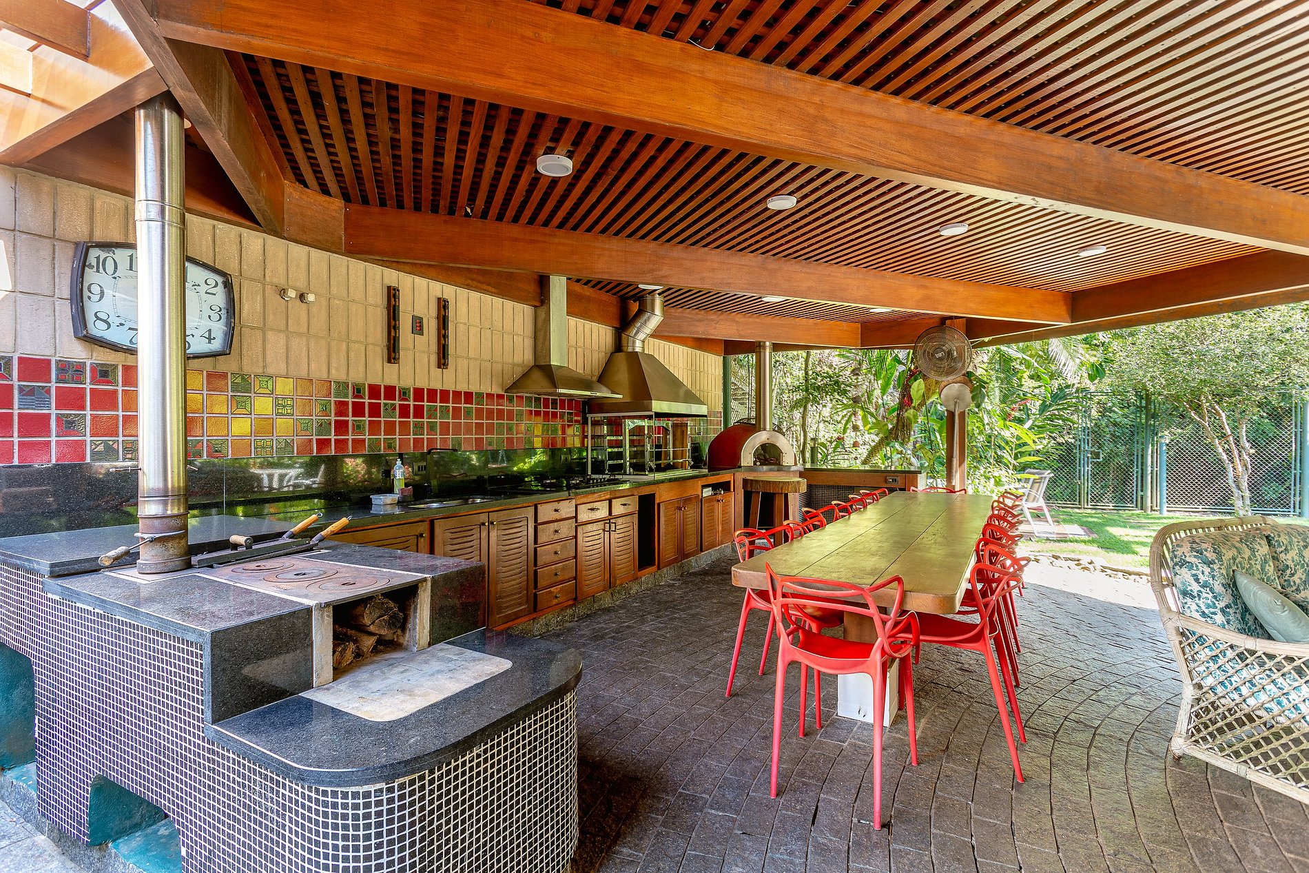 A área externa é o destaque da propriedade. A grande piscina, cercada de espreguiçadeiras, é perfeita para se refrescar nos dias mais quentes ou relaxar ao sol. O espaço gourmet é equipado com churrasqueira, fogão a lenha, forno de pizza, máquina de gelo e bancada de apoio, proporcionando momentos únicos de confraternização. Além disso, a casa oferece mesa de sinuca, mesa de ping-pong e um pula-pula para as crianças se divertirem.