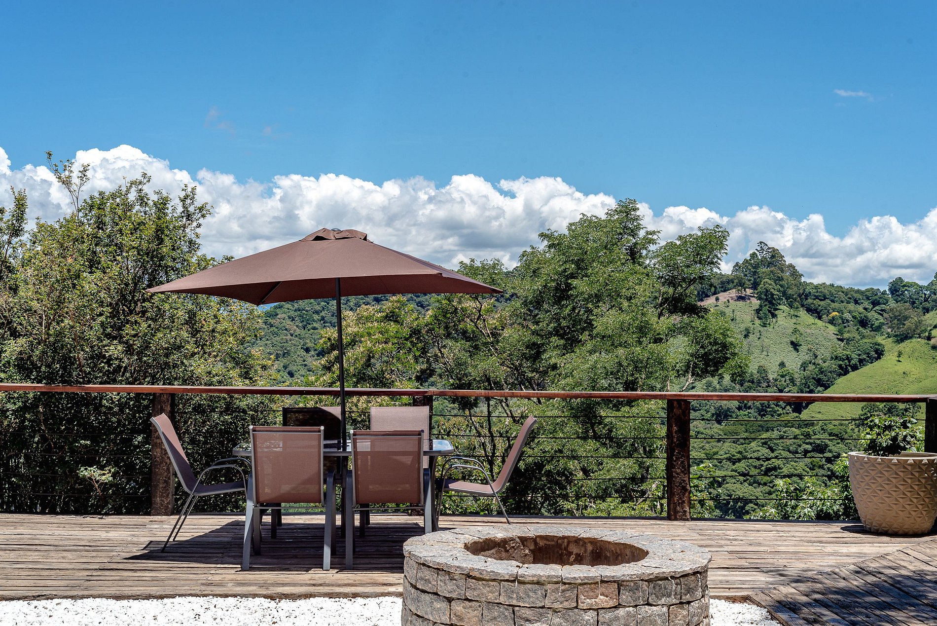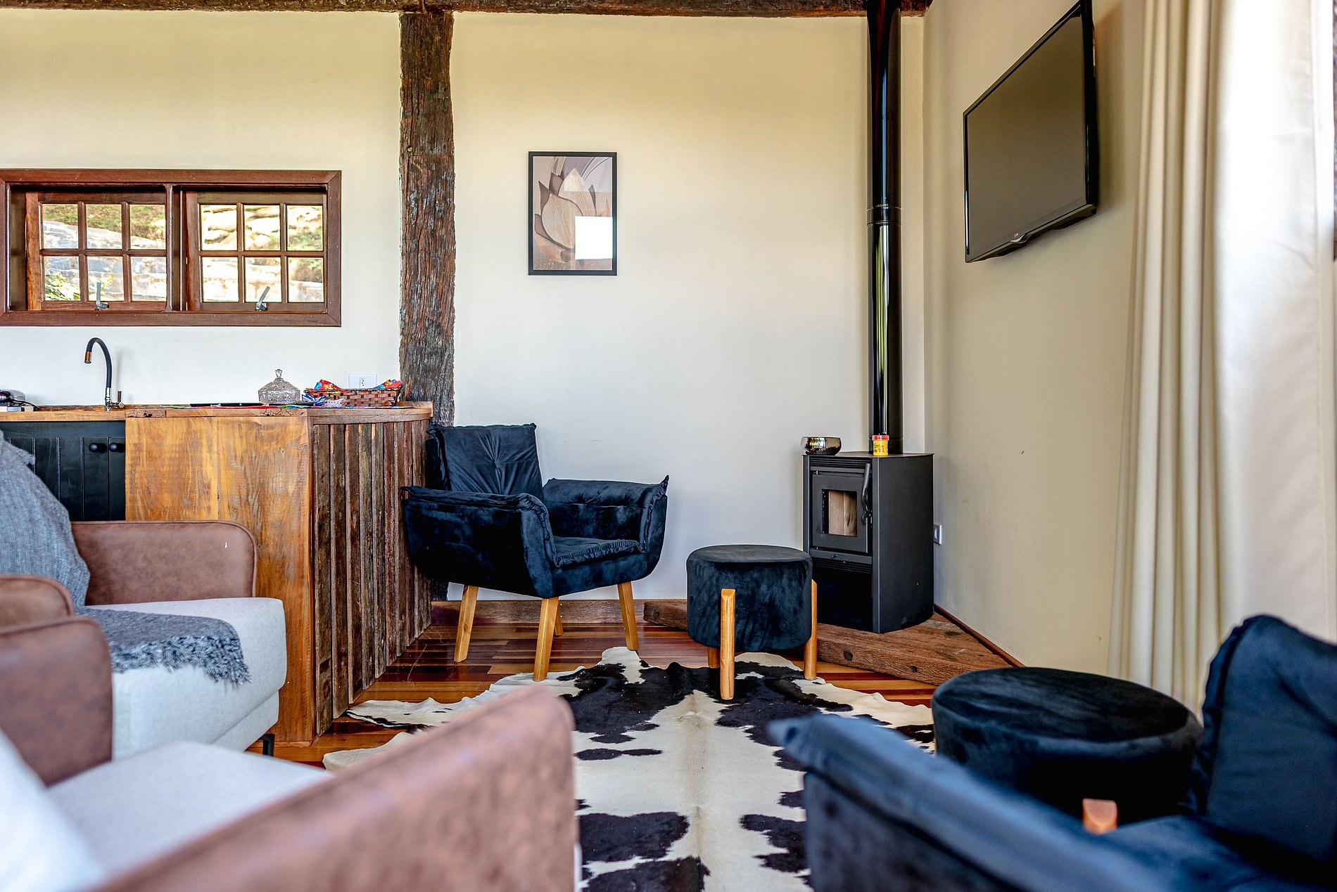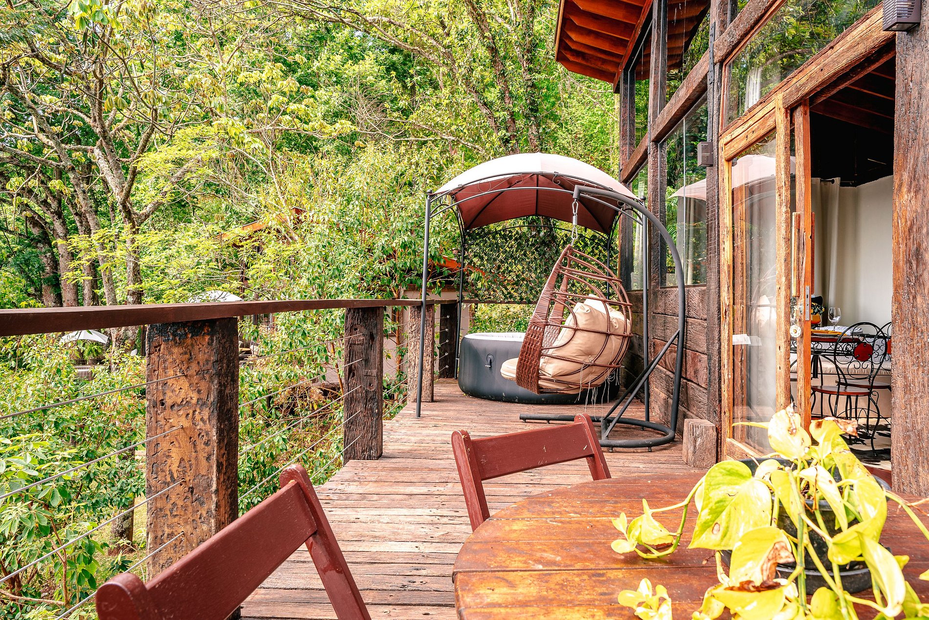 Contamos com quatro chalés incríveis, que proporcionam privacidade, além de uma área comum completa, com bar, piscina, mesas e fogo de chão — tudo para que você viva momentos inesquecíveis em meio à natureza.