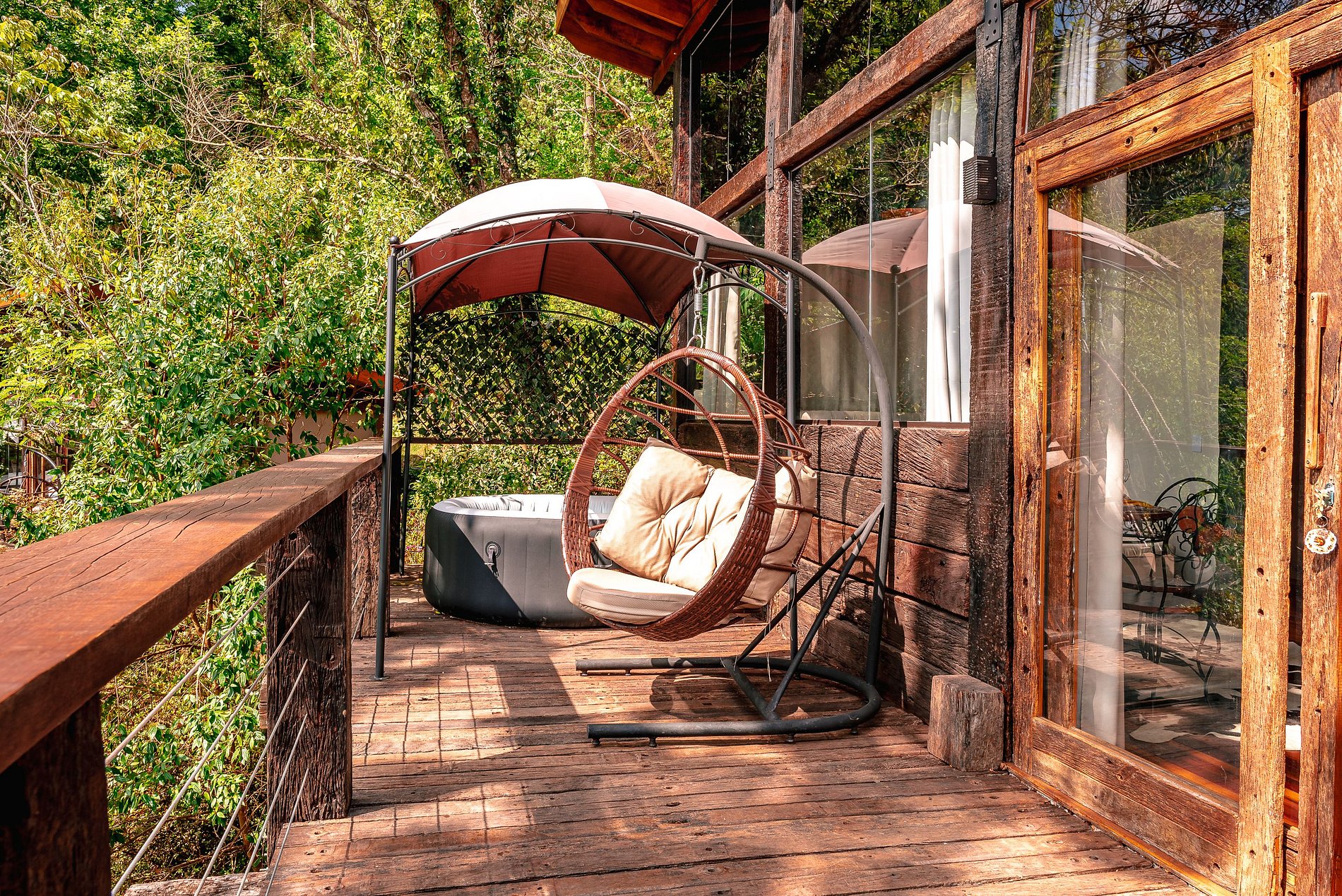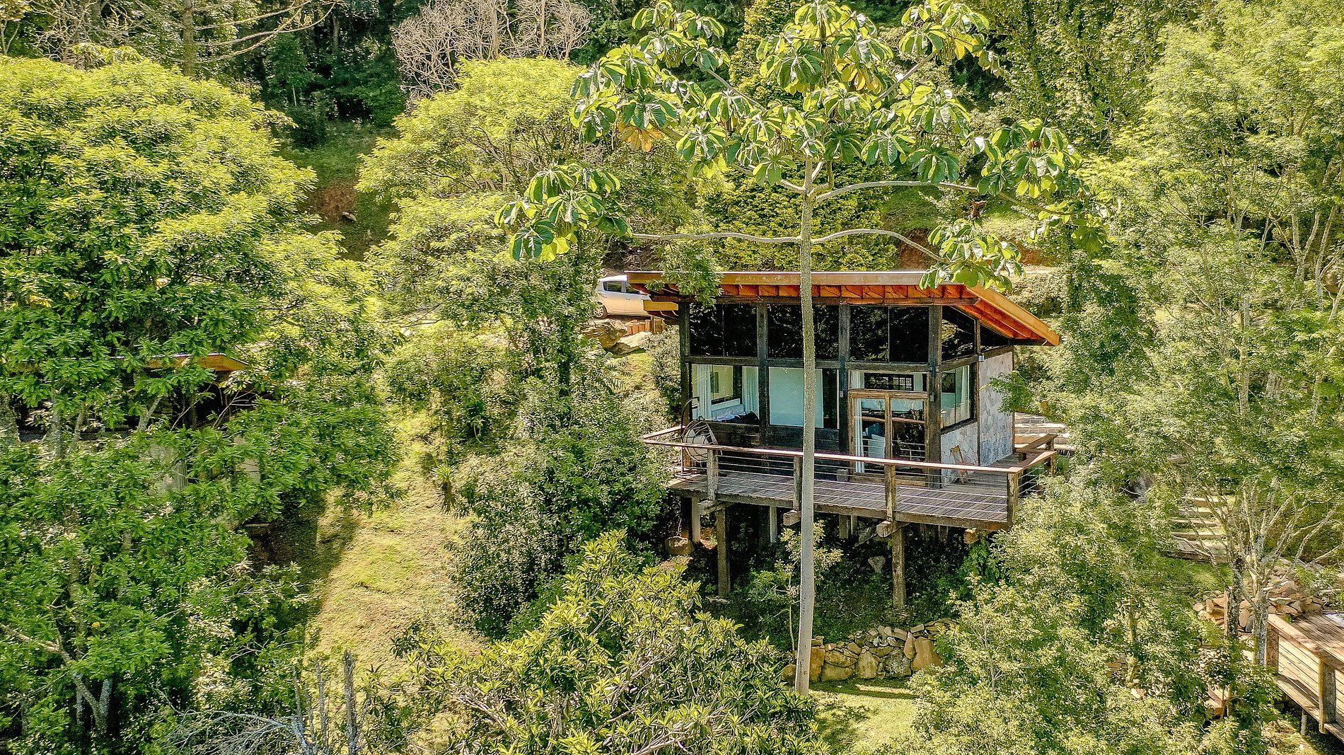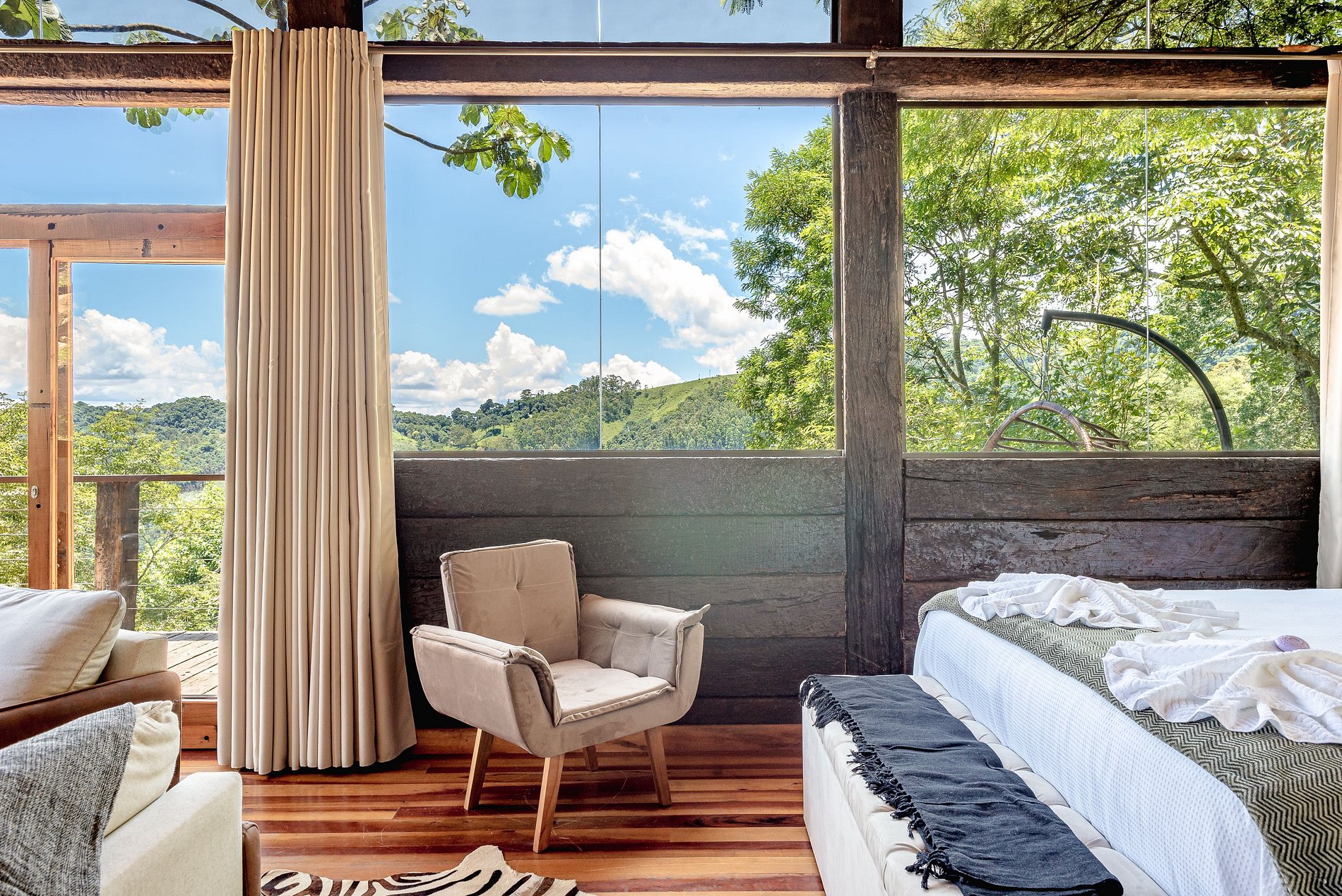 Contamos com quatro chalés incríveis, que proporcionam privacidade, além de uma área comum completa, com bar, piscina, mesas e fogo de chão — tudo para que você viva momentos inesquecíveis em meio à natureza.