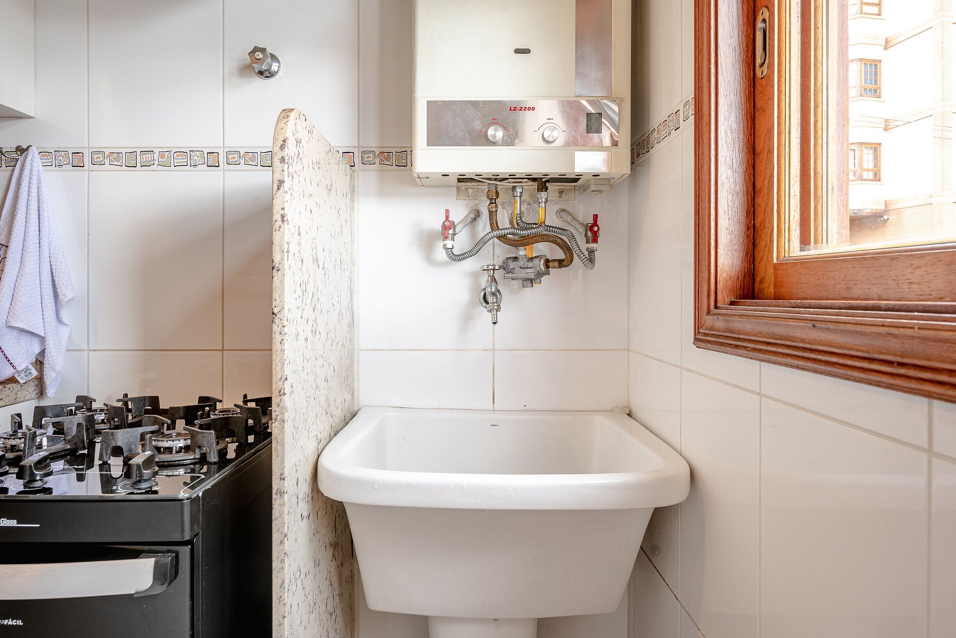 A cozinha é equipada com utensílios, air fryer, micro-ondas, sanduicheira, filtro de água, taças e cafeteira para cápsulas Delta.