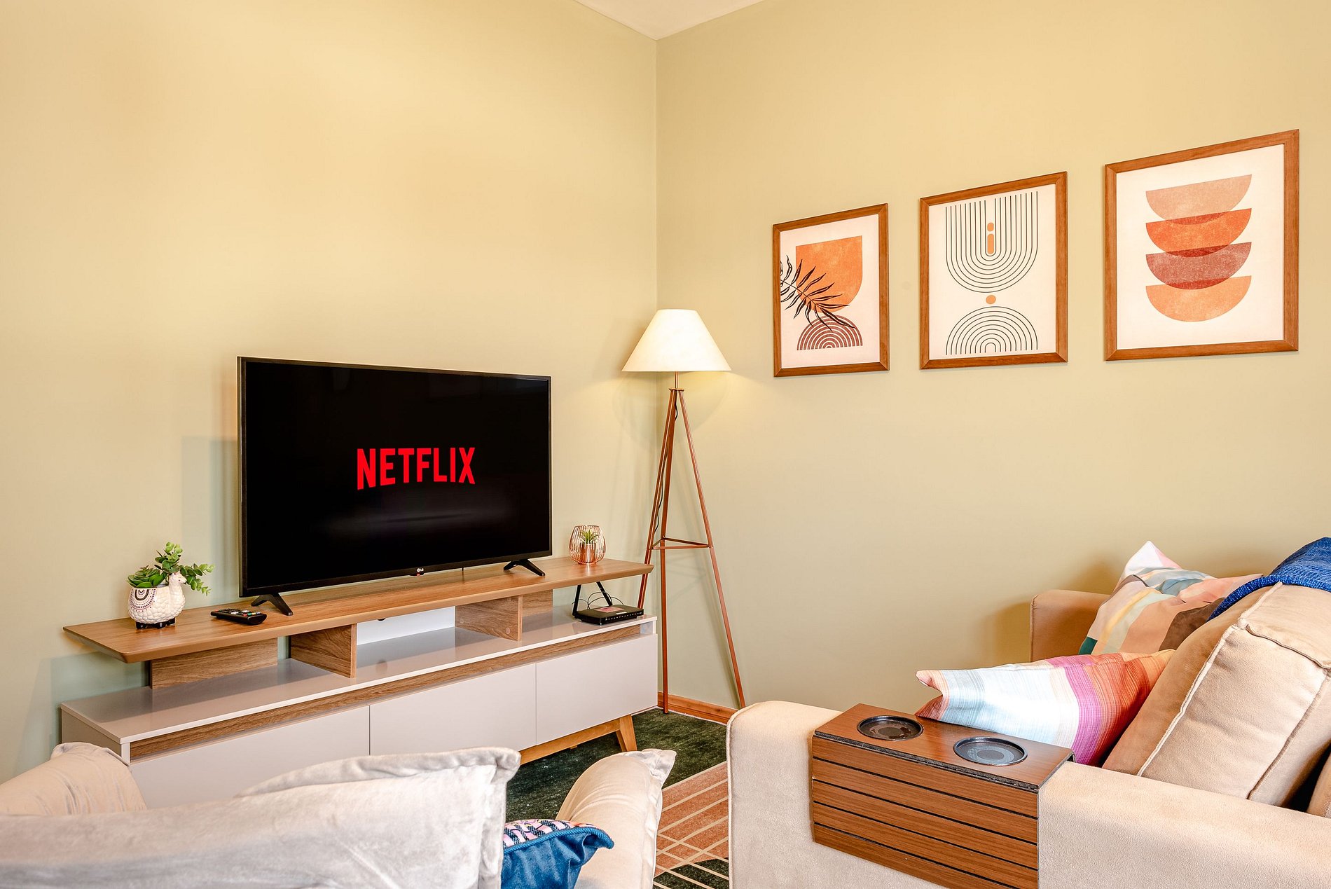 Lareira a gás na sala para noites ainda mais especiais.